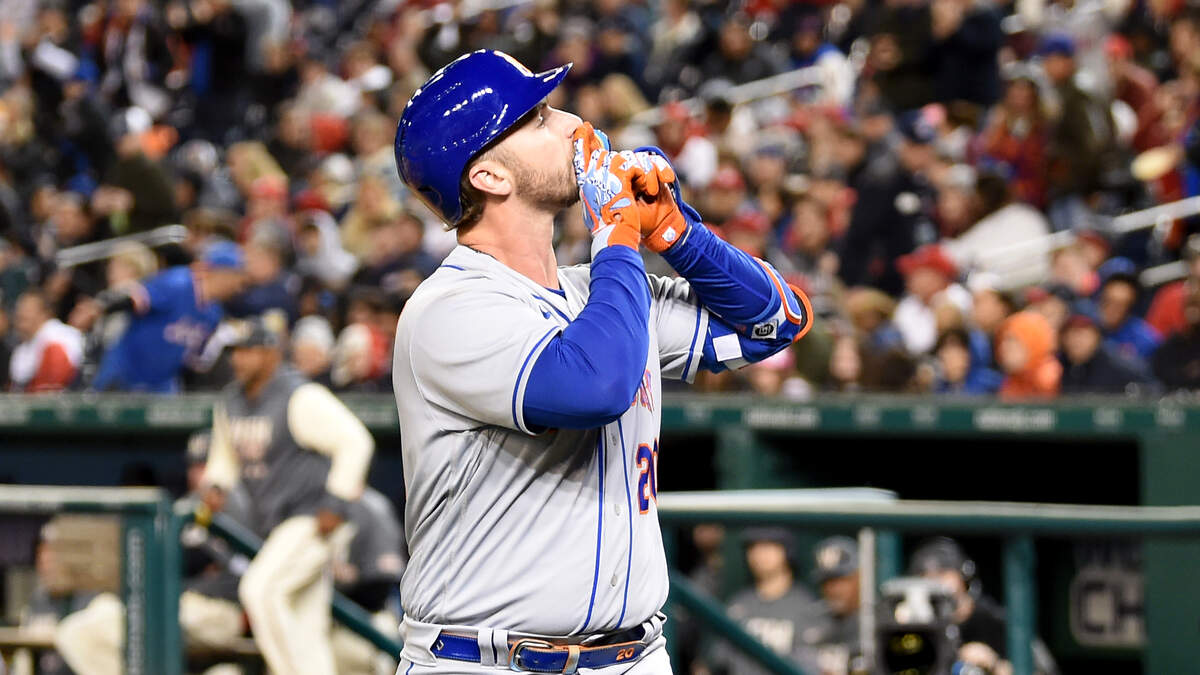 Pete Alonso twirled his bat when his first career grand slam broke a scoreless tie in the fifth inning, then put his index fingers to his mouth as if hushing the crowd after celebrating with teammates near the plate, propelling the New York Mets to a 5-0 victory over the Washington Nationals on Saturday night.
