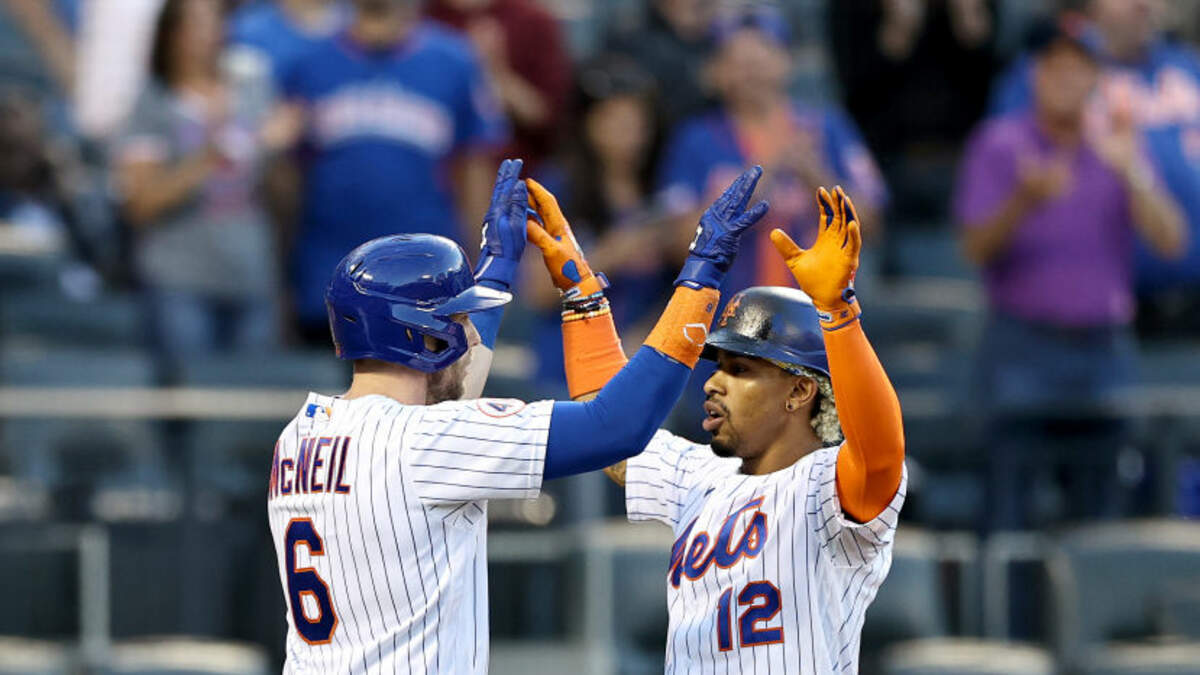 NEW YORK, NEW YORK - JUNE 23: Francisco Lindor #12 of the New York Mets celebrates his two run home run with teammate he drove in Jeff McNeil #6 in the second inning against the Atlanta Braves at Citi Field on June 23, 2021 in the Flushing neighborhood of Queens.Photo: Getty Images North America