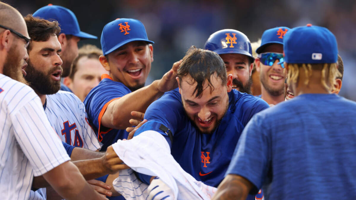 NEW YORK, NY - JUNE 26: Michael Conforto #30 of the New York Mets has his jersey ripped off by teammates after hitting a game-winning sacrifice fly during the ninth inning of a game against the Philadelphia Phillies at Citi Field on June 26, 2021Photo: Getty Images North America