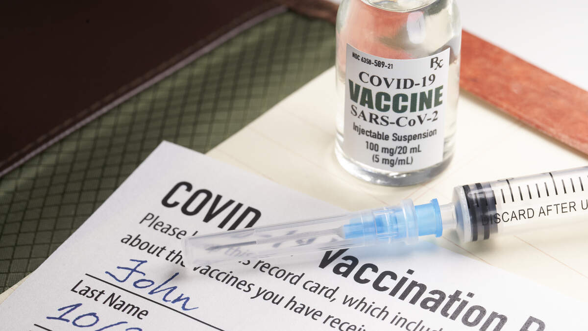 Covid-19 vaccination record card with syringe and vial