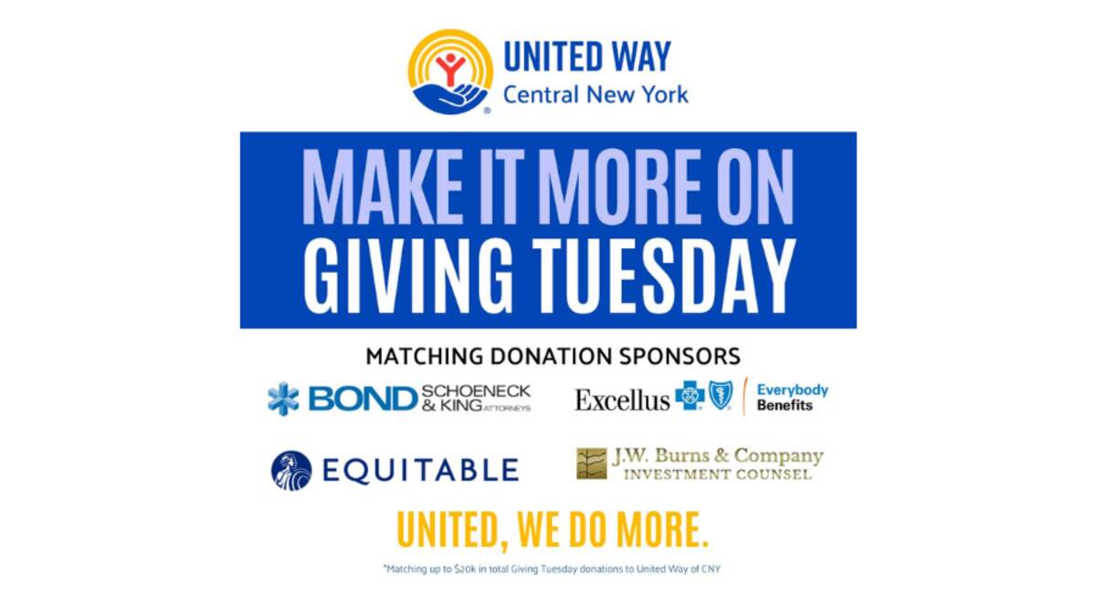 Today only, donate to United Way of Central New York and our generous Giving Tuesday matching donation sponsors will MAKE IT MORE!